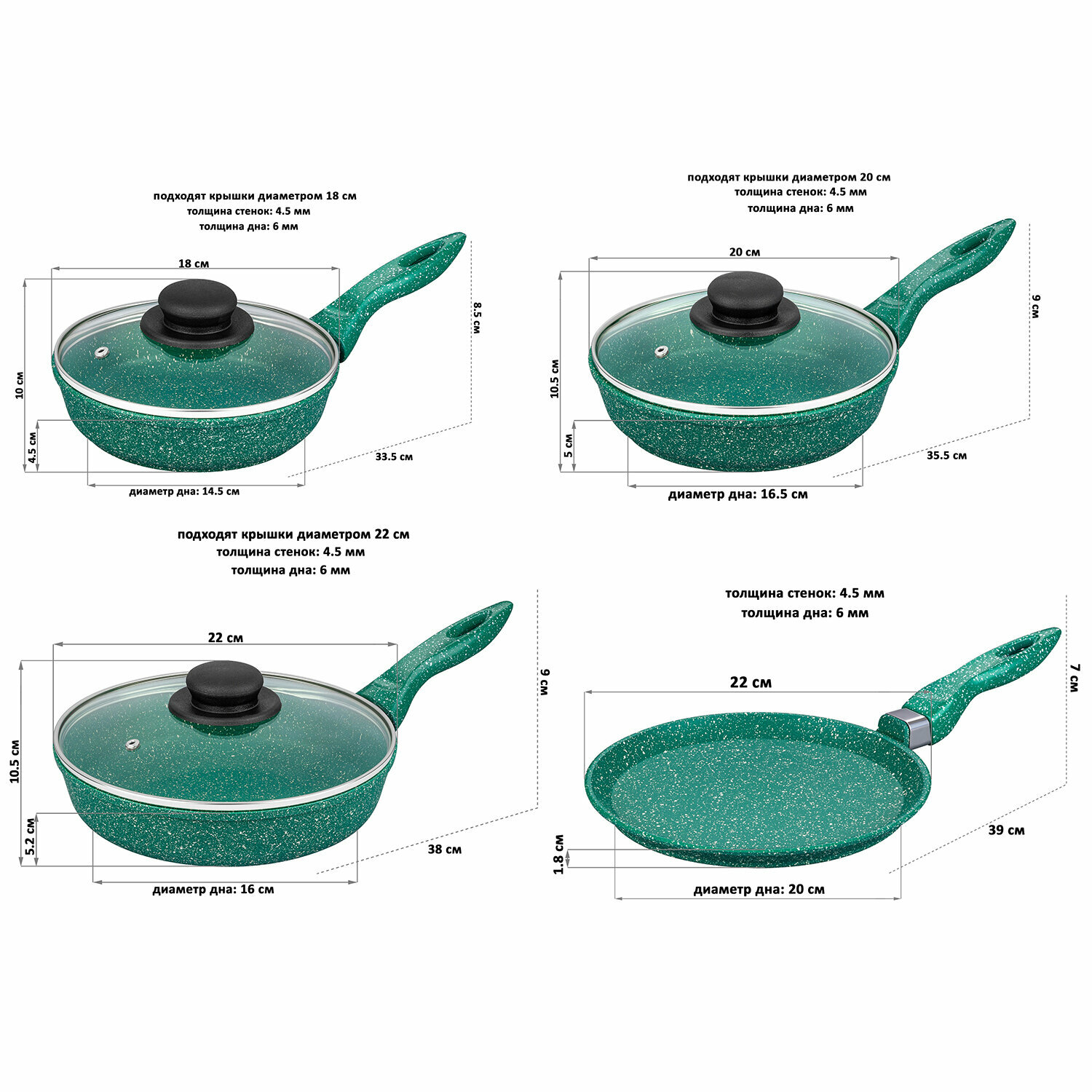 Набор 7 пр. Elan Gallery гармония Вкуса Изумруд Сковорода блинная 22 см, Сковороды 18 см, 20 см, 22 см, н/р, 3 крышки информация:
