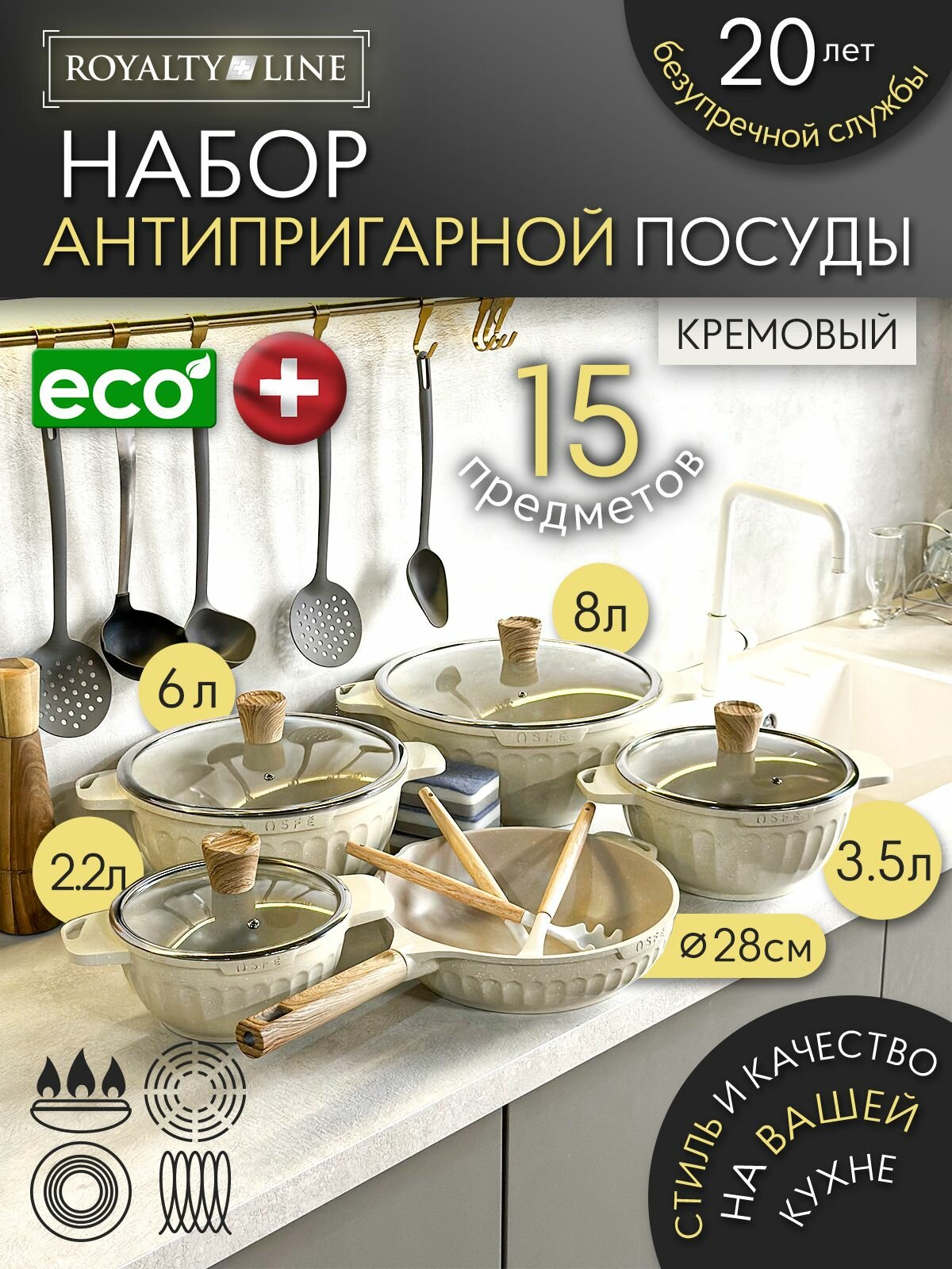Отзывы на Набор посуды 15 предметов для приготовления Royalty Line OSFE с мраморным покрытием, антипригарная, кремовый