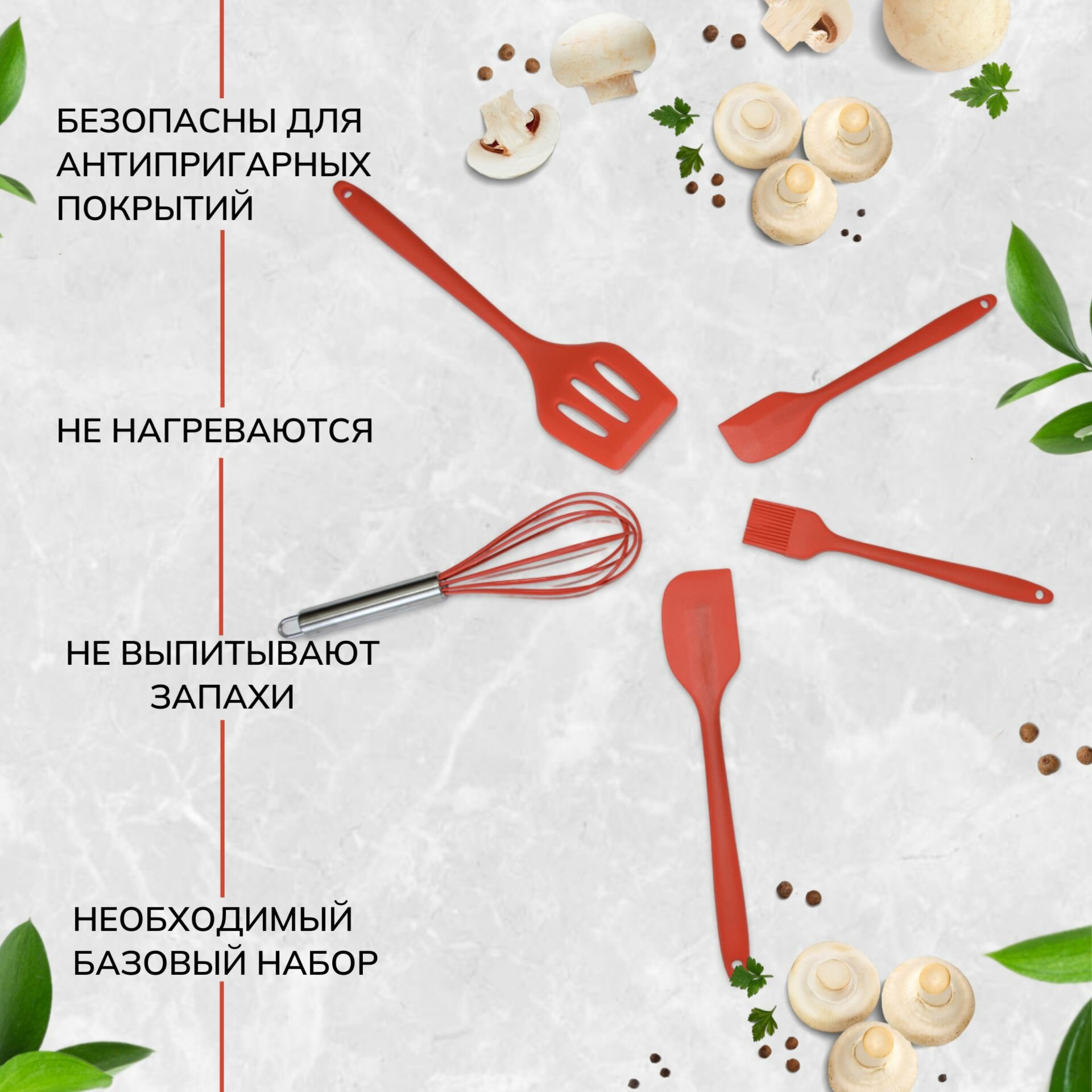 Отзывы на Набор кухонных принадлежностей для готовки силиконовый, 5 предметов, красный