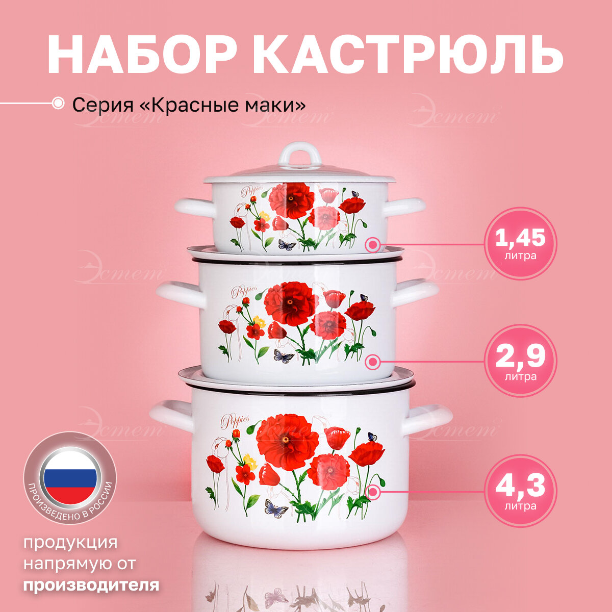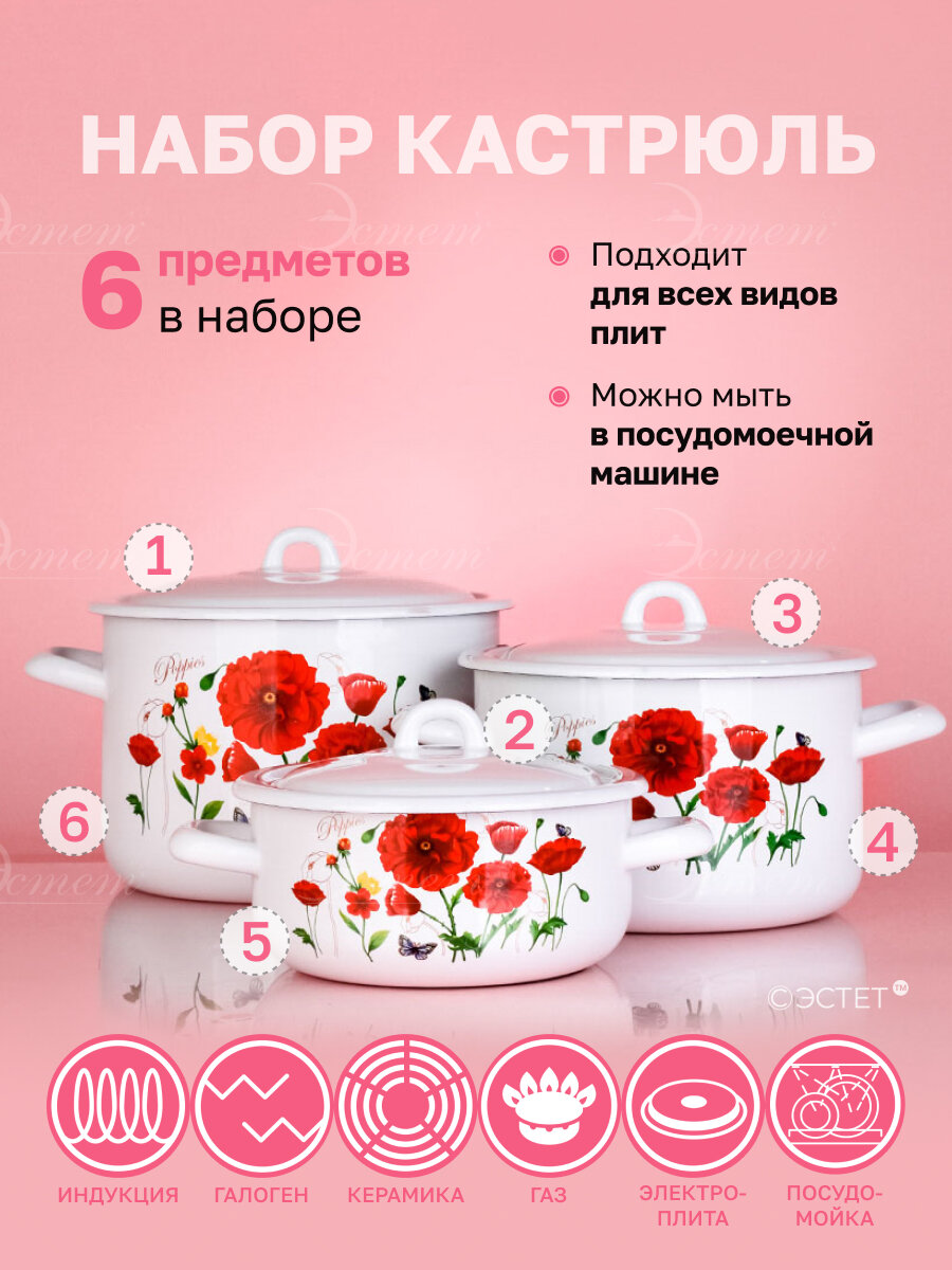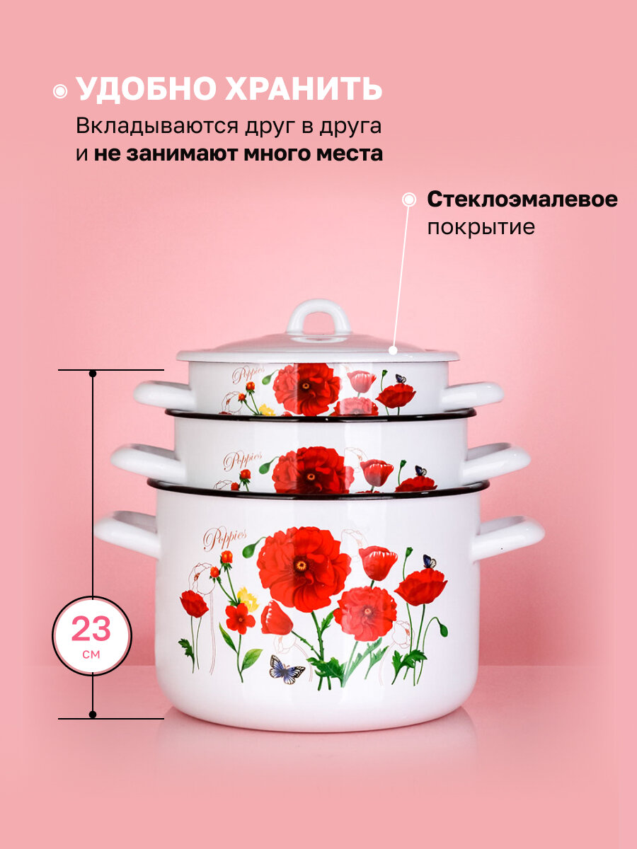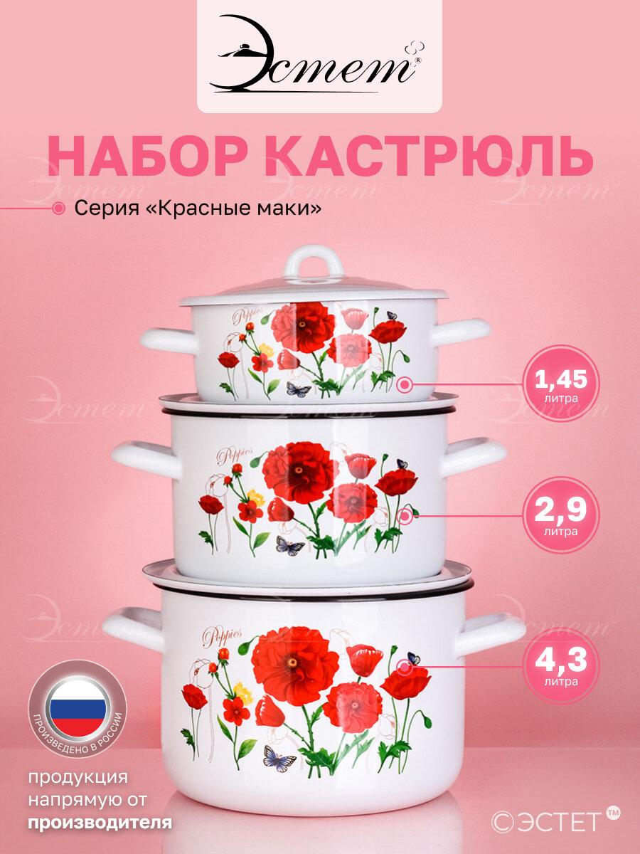 Набор кастрюль Эстет Красные маки, эмалированный, сталь, 1.45/2.9/4.3 л, 3 шт информация:
