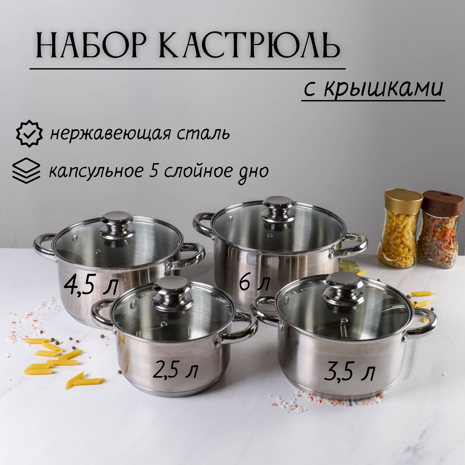 Набор кастрюль с крышкой из нержавеющей стали Ария 2,5л,3,5л,4,5л,6л информация: