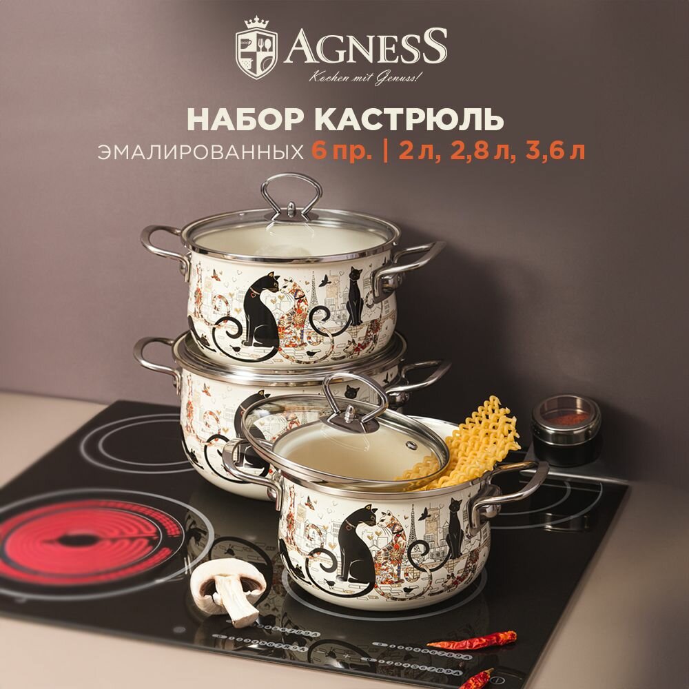 10 цен на Набор кастрюль Agness "Парижские Коты", 3 шт, эмалированные, с крышками, для всех видов плит