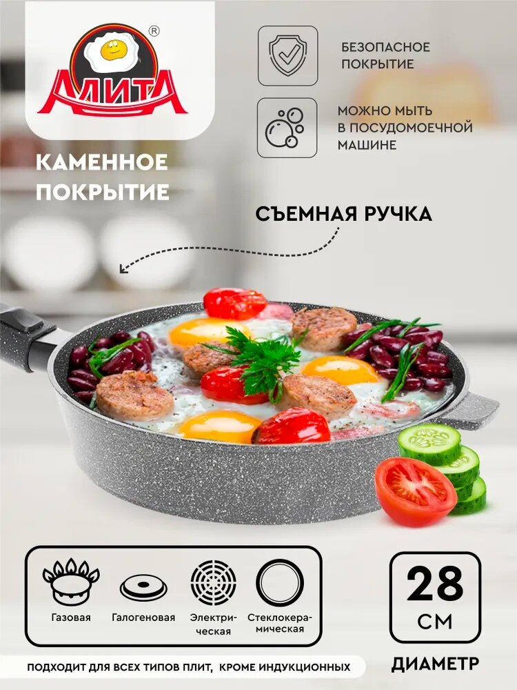 Сковорода Алита Хозяюшка Природный камень с антипригарным покрытием, со съемной ручкой, из алюминия, диаметром 28см 2 842 ₽