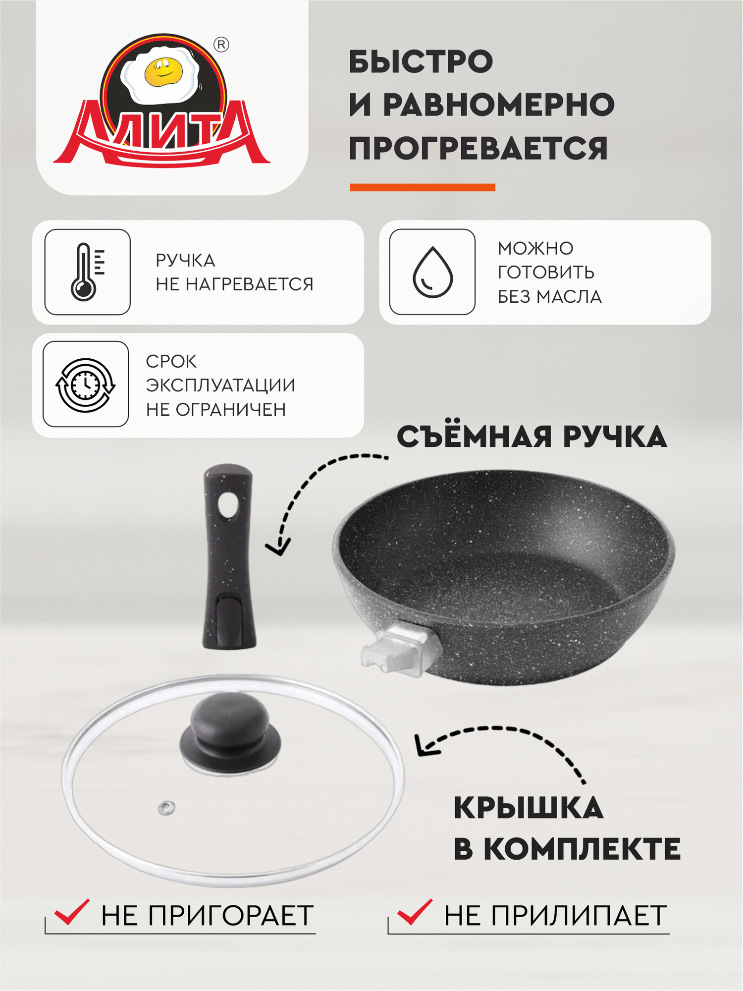 10 цен на Сковорода с крышкой 20 см маленькая со съемной ручкой глубокая с толстым дном, Природный камень