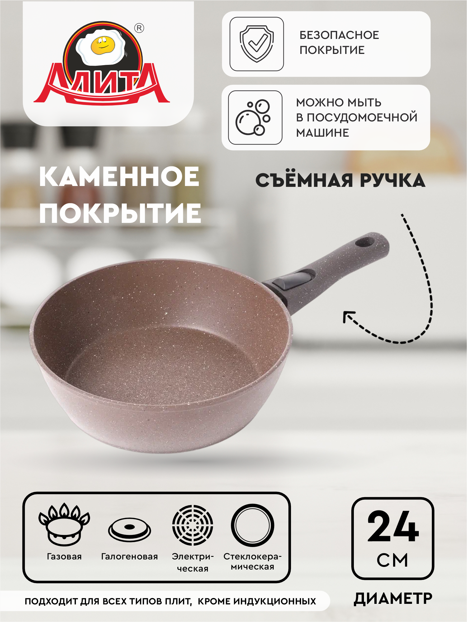 Сковорода 24 см со съемной ручкой антипригарная глубокая, литая алюминиевая, Браун информация: