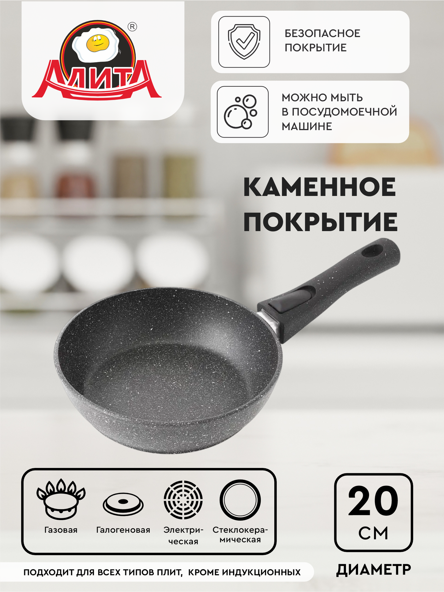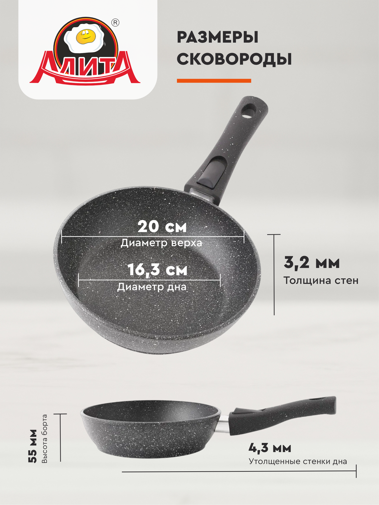 Сковорода со съемной ручкой 20 см с толстым дном глубокая маленькая, Природный камень информация: