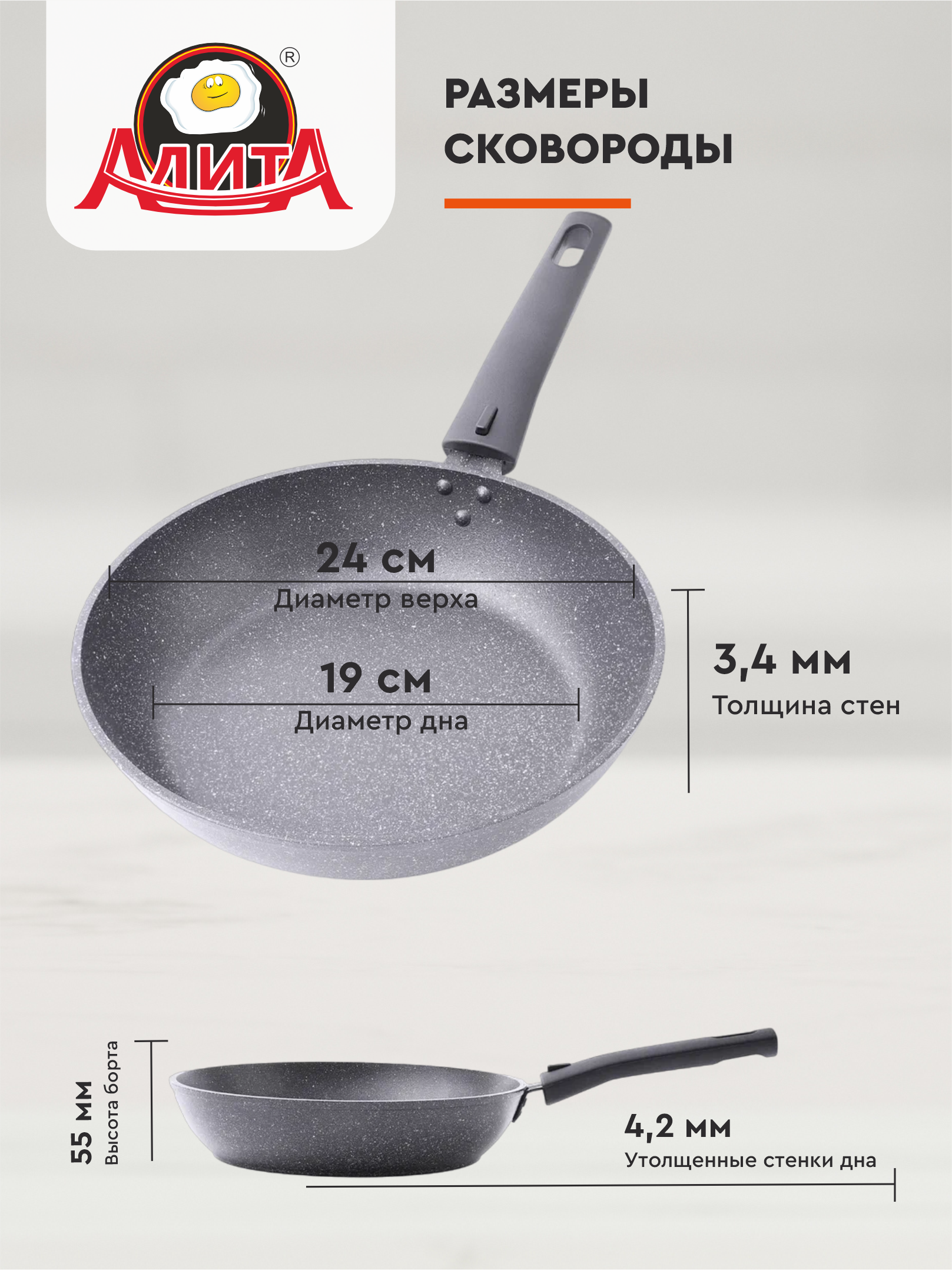 Сковорода 24 см со съемной ручкой антипригарная алюминиевая литая глубокая, Природный камень информация: