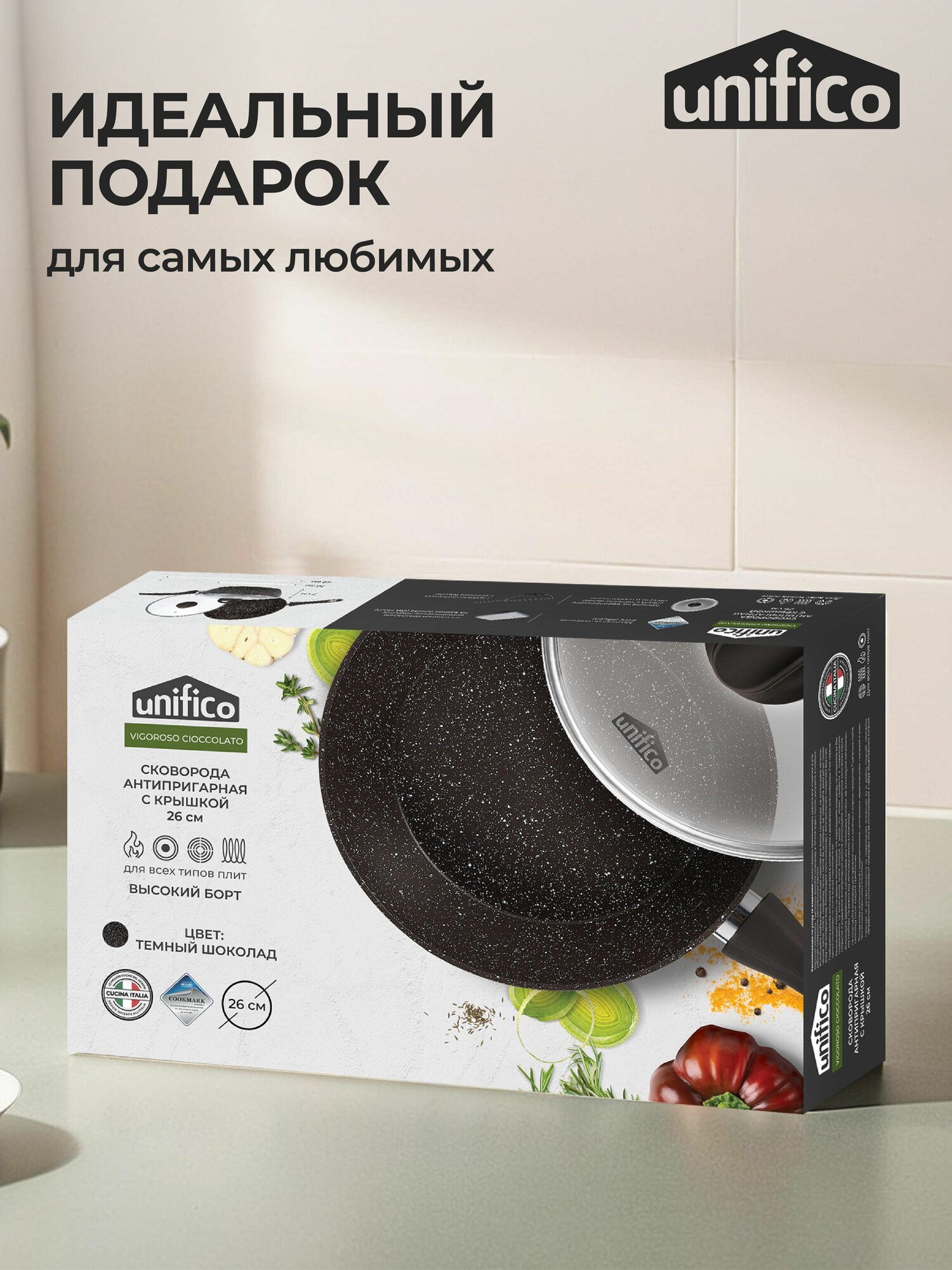 Сковорода с крышкой 26 см глубокая (индукция) UNIFICO Vigoroso Cioccolato (широкое дно) информация: