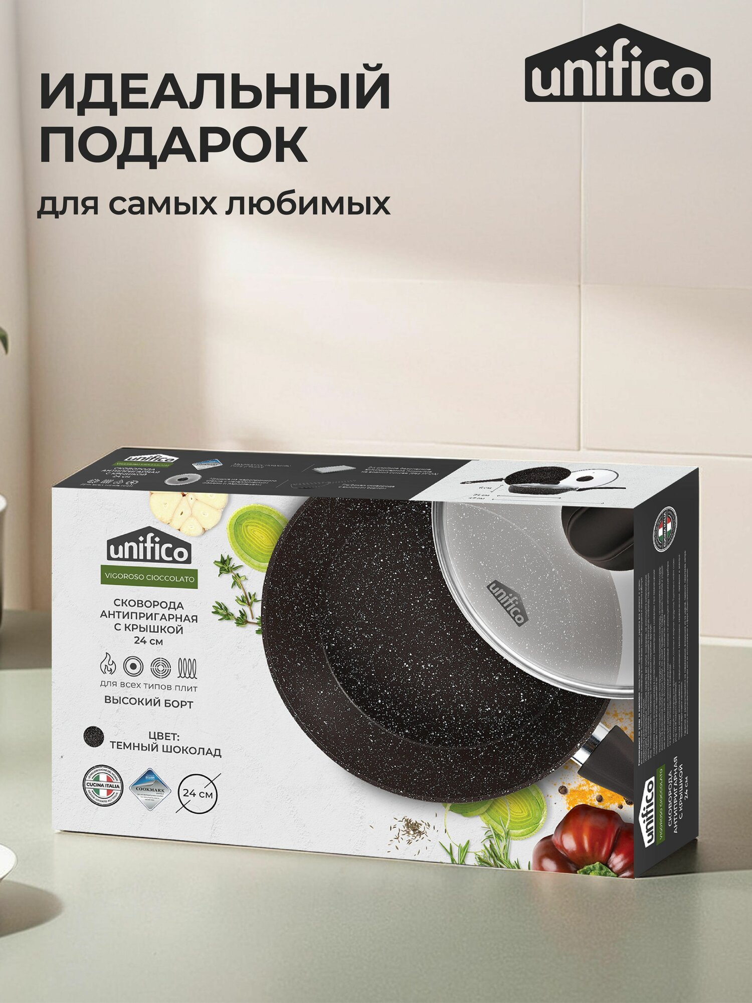 Сковорода с крышкой 24 см глубокая (индукция) UNIFICO Vigoroso Cioccolato (широкое дно) информация: