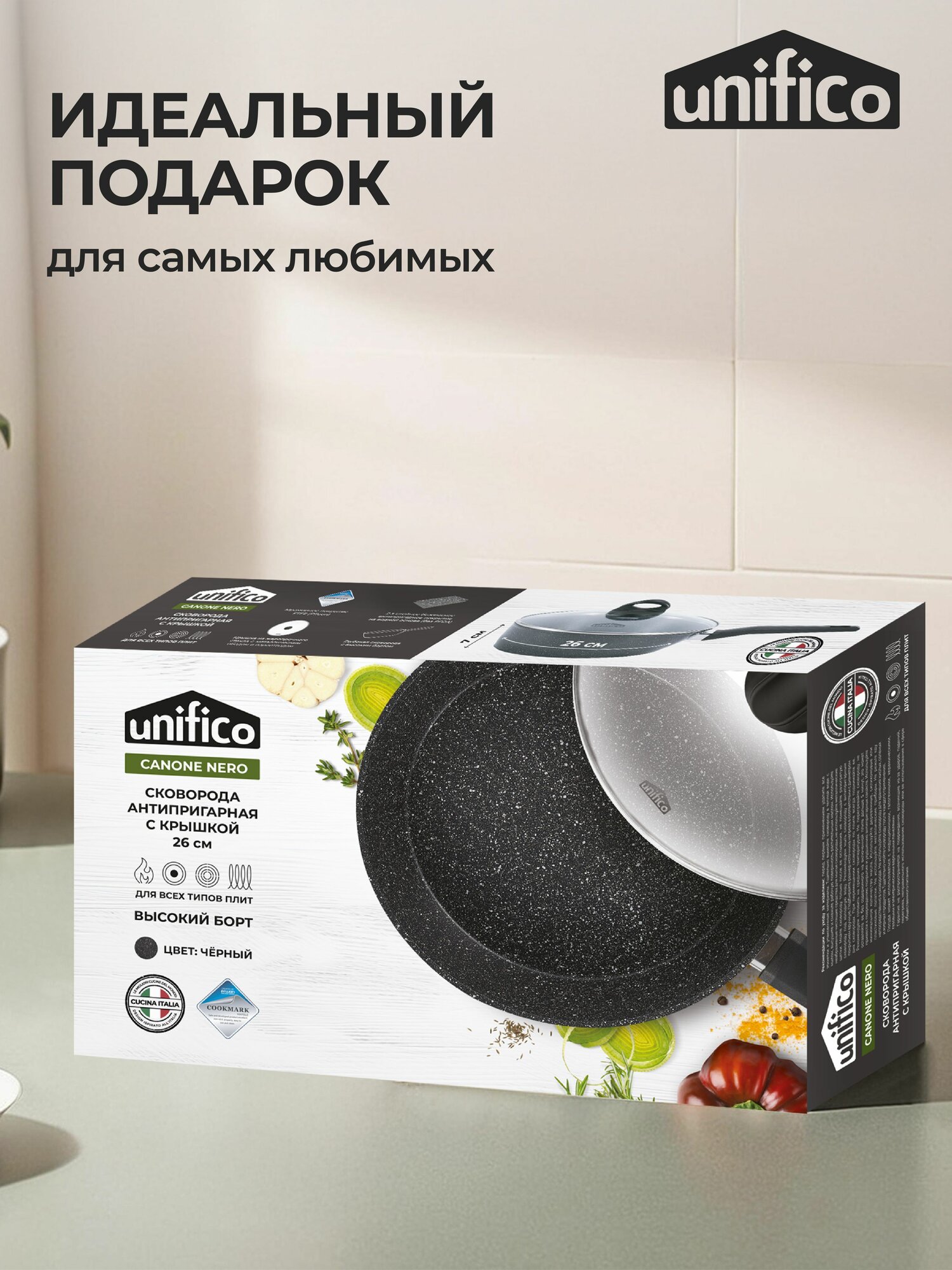 Сковорода с крышкой 26 см глубокая (индукция) UNIFICO Canone Nero (широкое дно) информация: