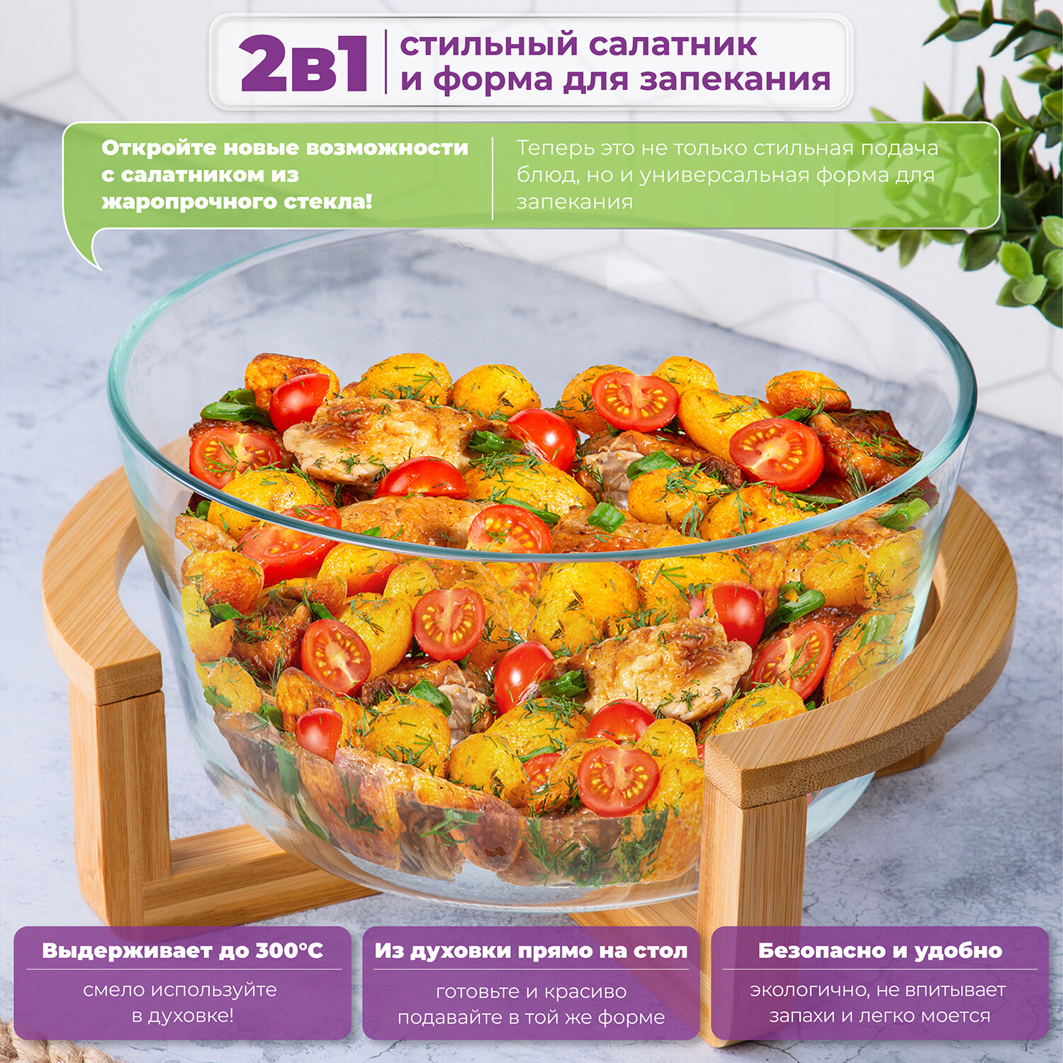 Отзывы на Блюдо, салатник для сервировки и запекания 2,6 л Elan Gallery GLASKRAFT, 24х21,5х13 см, круглое с бамбуковой подставкой
