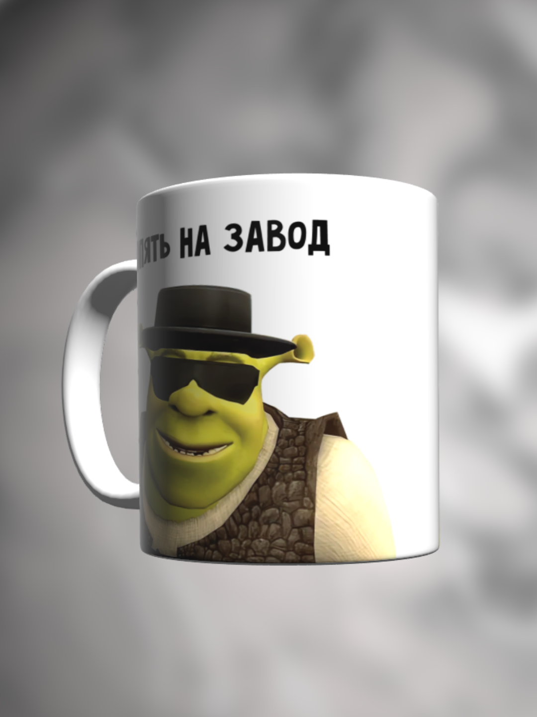 Кружка с приколом мем Шрек Опять на завод в очках на белом фоне информация: