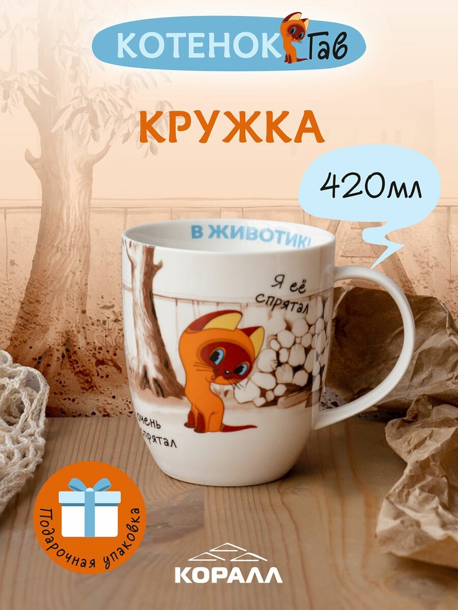10 цен на Кружка большая белая фарфор 420 мл. в подарочной упаковке Котенок Гав " Я её спрятал в животик"