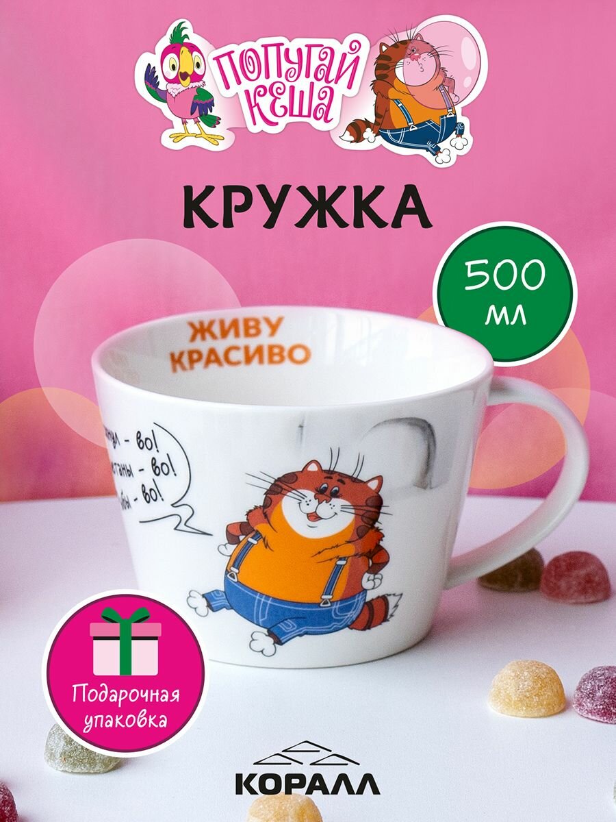Кружка большая белая фарфор 500 мл. "Попугай Кеша" в подарочной упаковке. Коралл информация: