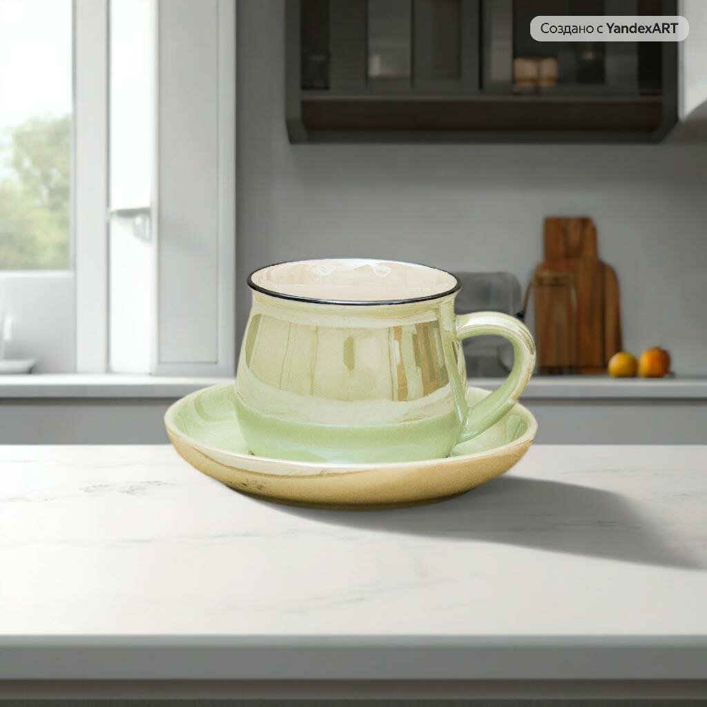10 цен на Кружка кофейная с блюдцем Rich 180 мл Зеленая перламутровая, чайная пара, чашка для чая и кофе, женская, подарочная