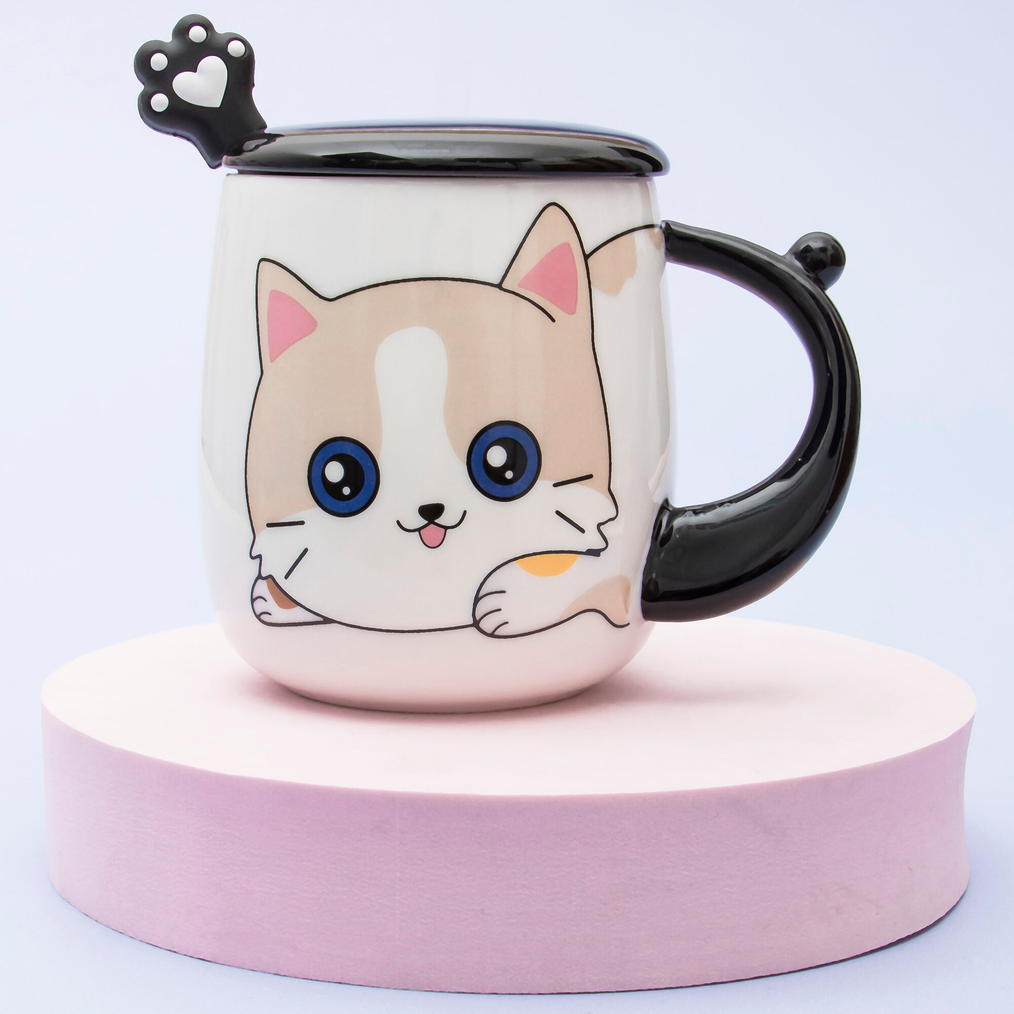 Кружка керамическая "Котик" белый 430 мл, с крышкой и ложкой, чашка детская, аниме, женская, подарочная 931 ₽