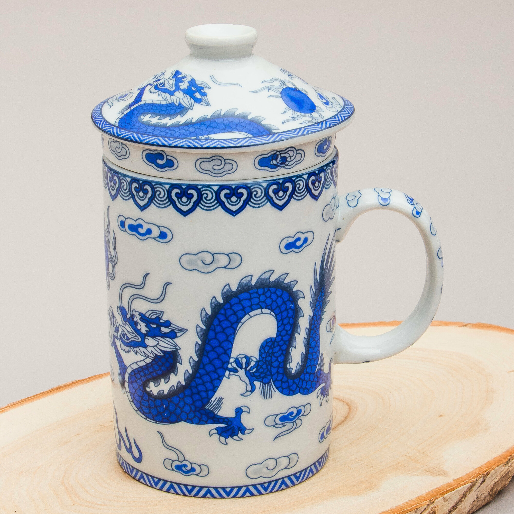 10 цен на Кружка с ситечком Дракон N 7 (бело-синий) чашка заварочная 300 мл Эврика, подарочная, символ года, для чайных церемоний 23 февраля, 8 марта