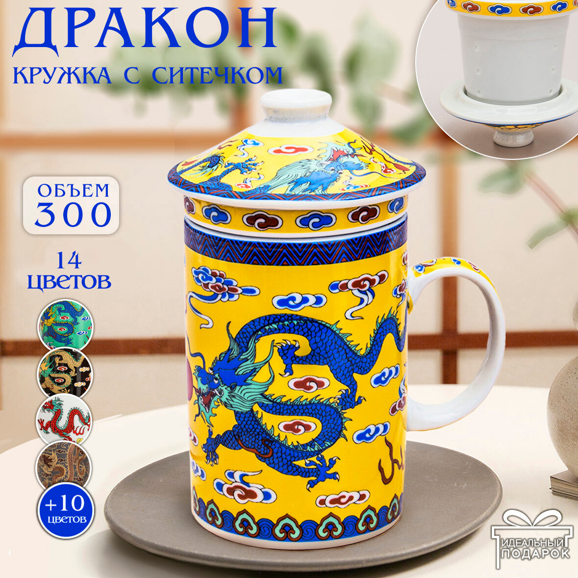 10 цен на Кружка с ситечком Дракон N 1 (желтый) чашка заварочная 300 мл Эврика, подарочная, символ года, для чайных церемоний 23 февраля, 8 марта