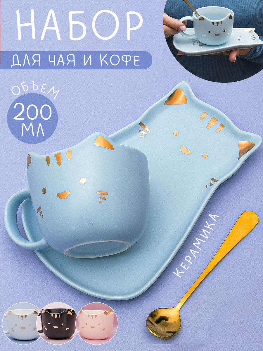 10 цен на Кружка с блюдцем Котик Cute Cat Синий 200 мл Эврика, кофейная пара, чайная, подарочная женская 14 февраля, 8 марта