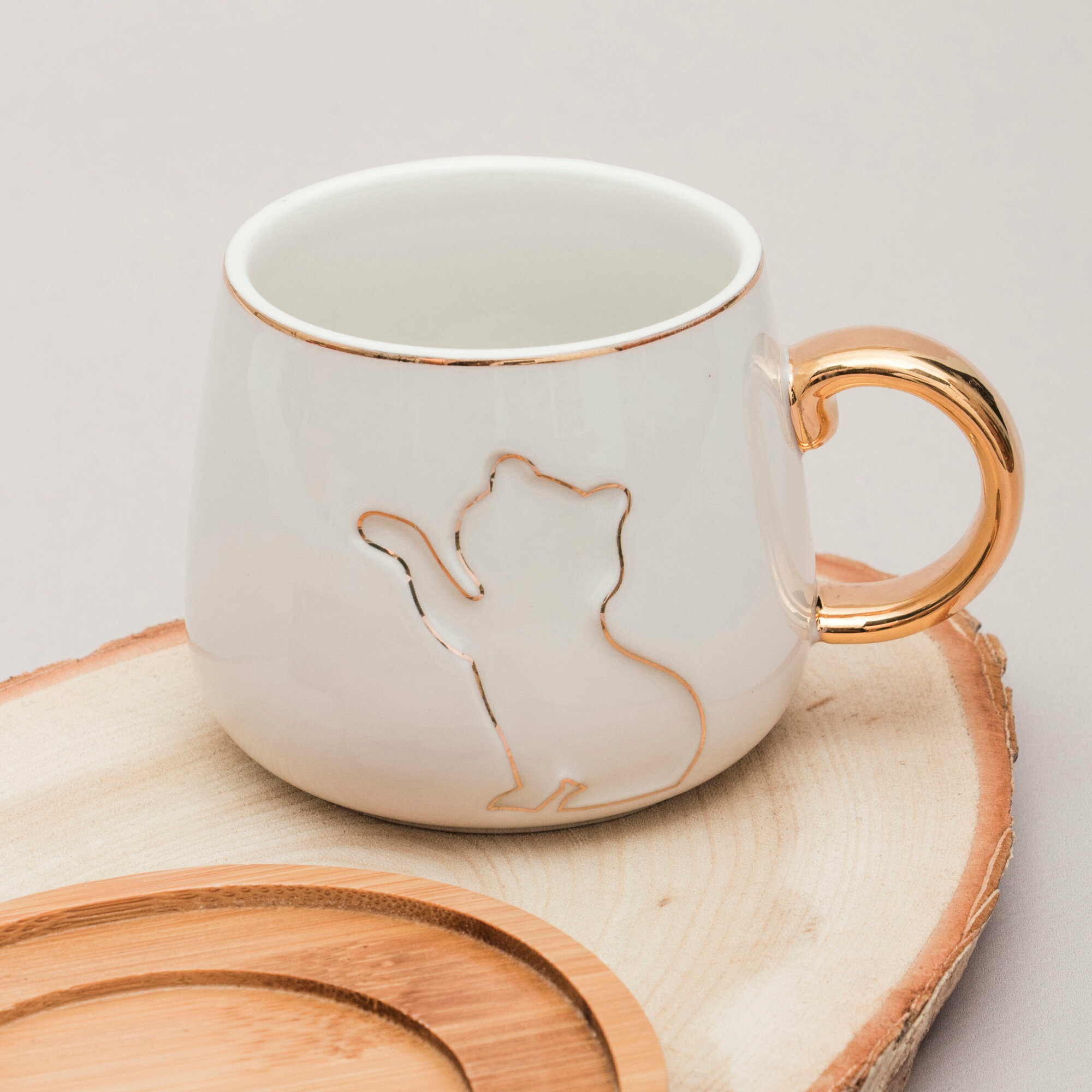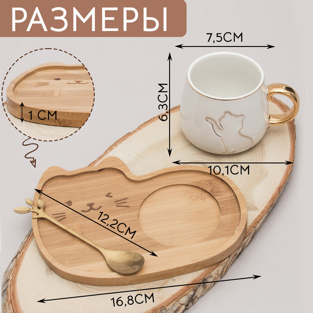 10 цен на Кружка с блюдцем бамбук Котик Белый 160 мл Эврика, кофейная пара, подарочный набор женский, чашка с ложкой 14 февраля, 8 марта