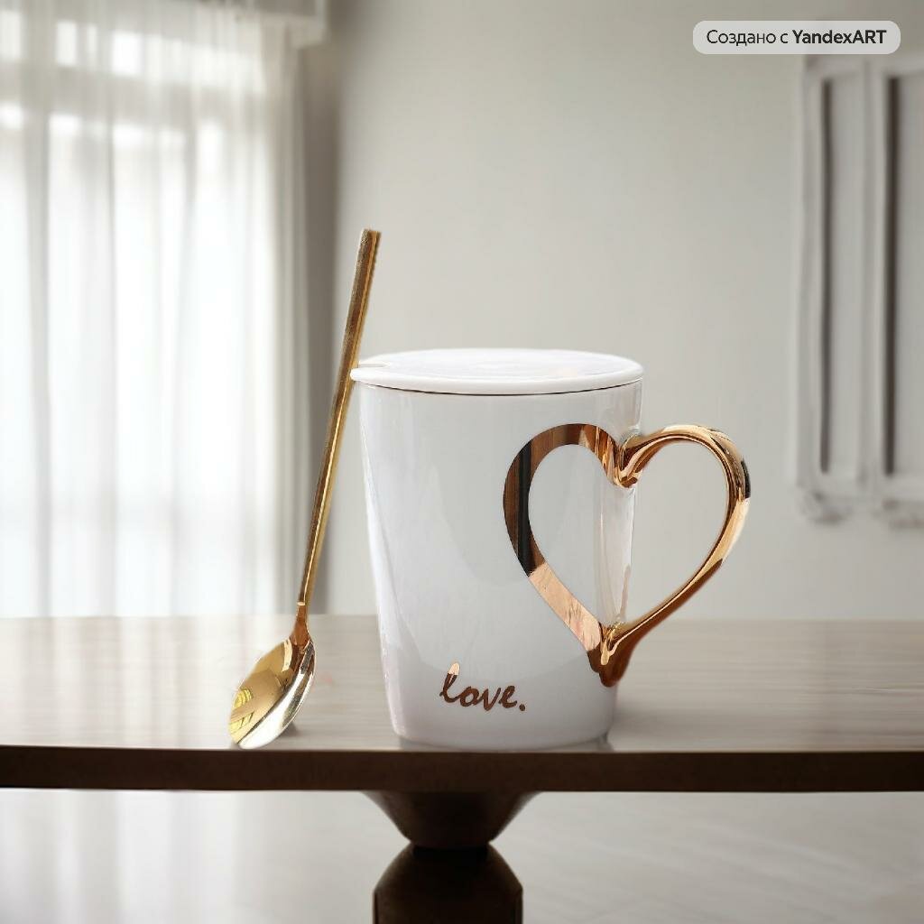 10 цен на Кружка керамическая Любовь Love "Золотое сердце" серая 300 мл, с крышкой и ложкой, женская, с надписью, подарочная