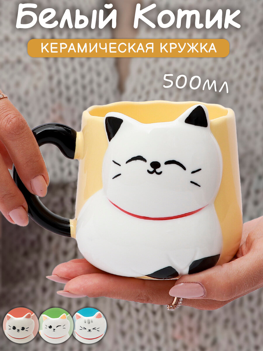 10 цен на Кружка керамическая "Белый котик" 500 мл желтая, для чая/кофе, большая, с принтом подарочная