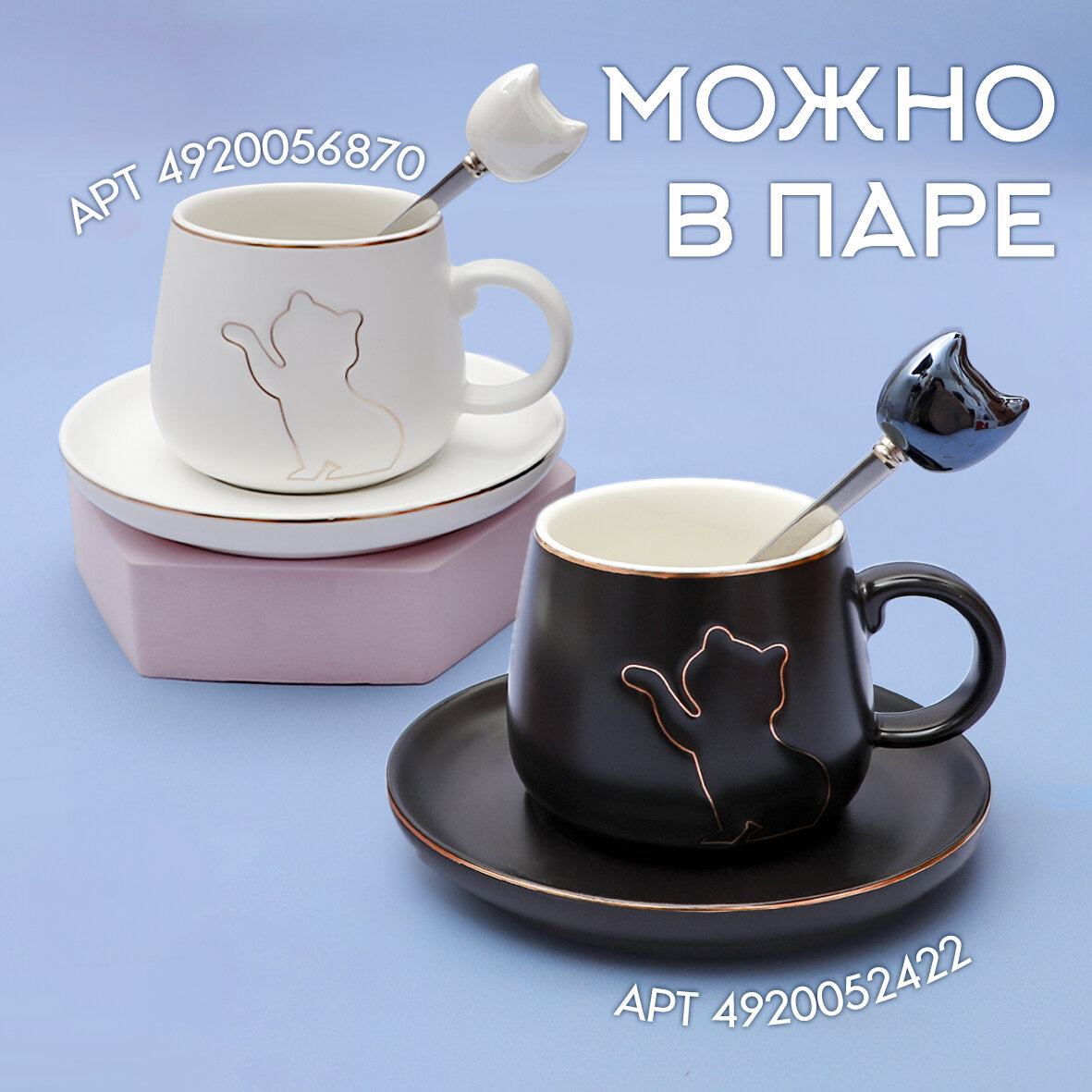 10 цен на Кружка с блюдцем Котик Белый 180 мл Эврика, чашка с ложкой, кофейная пара, женская, подарочная на 14 февраля, 8 марта