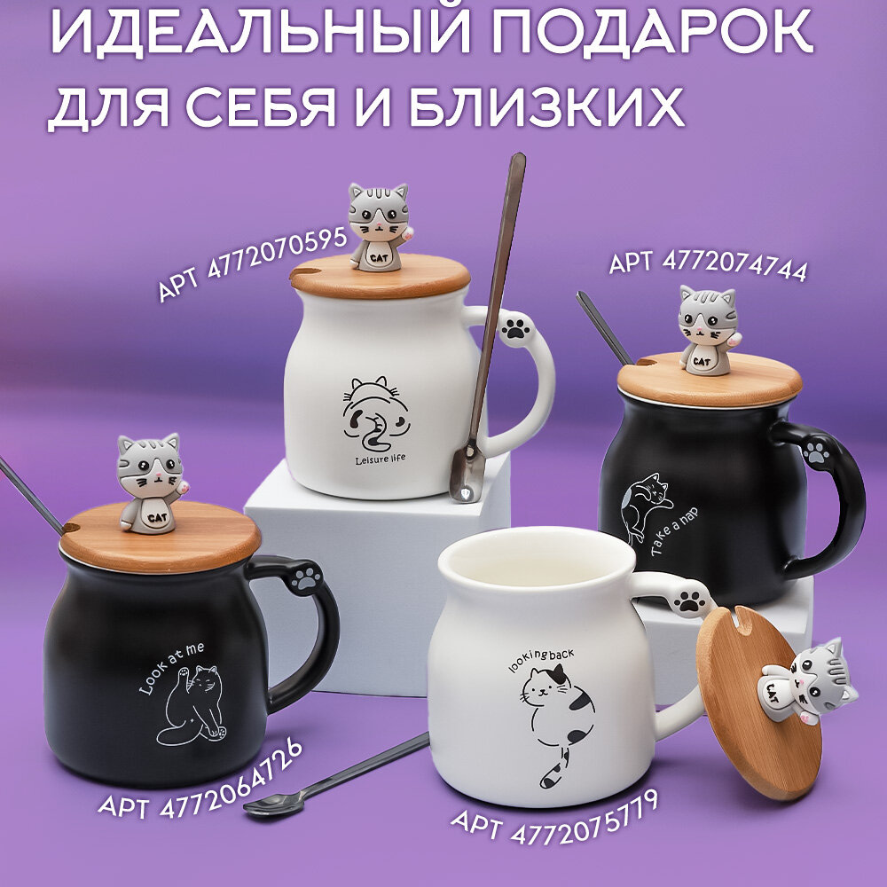 Кружка Кот с ложкой коричневый 360 мл Эврика (N 4), кружка с крышкой детская, женская, подарочная Котик, Котенок, Cat 23 февраля, 8 марта 1 218 ₽