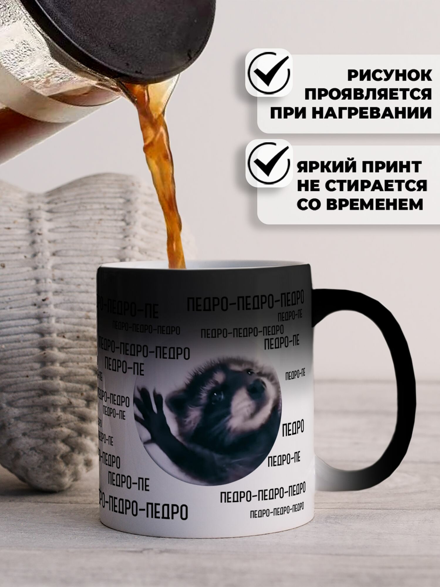 Кружка хамелеон для чая и кофе подарок с приколом, принтом и надписью "Енот педро" информация: