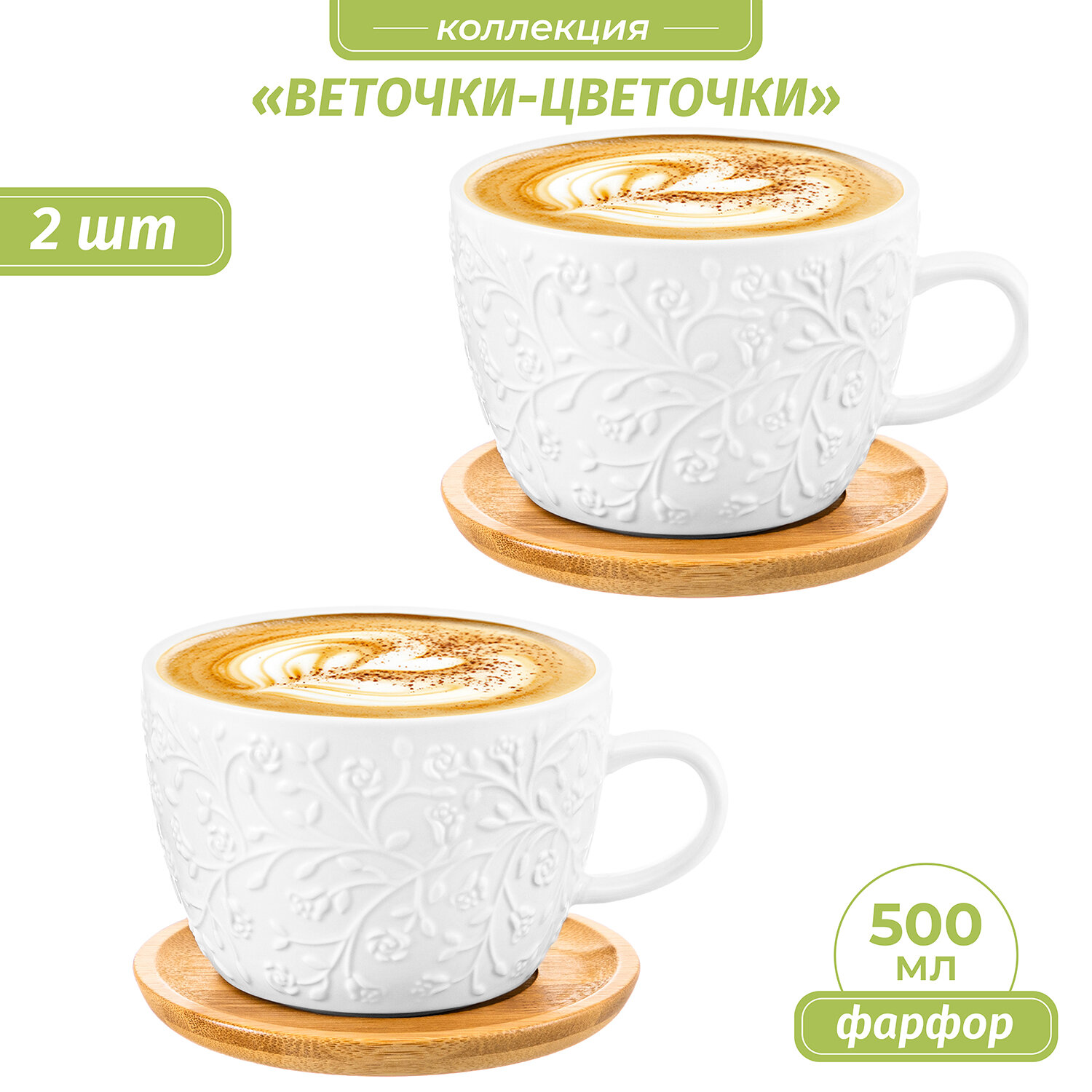 Чашка, кружка для кофе, чая 2 шт по 500 мл Elan Gallery Веточки-цветочки на деревянной подставке, набор информация: