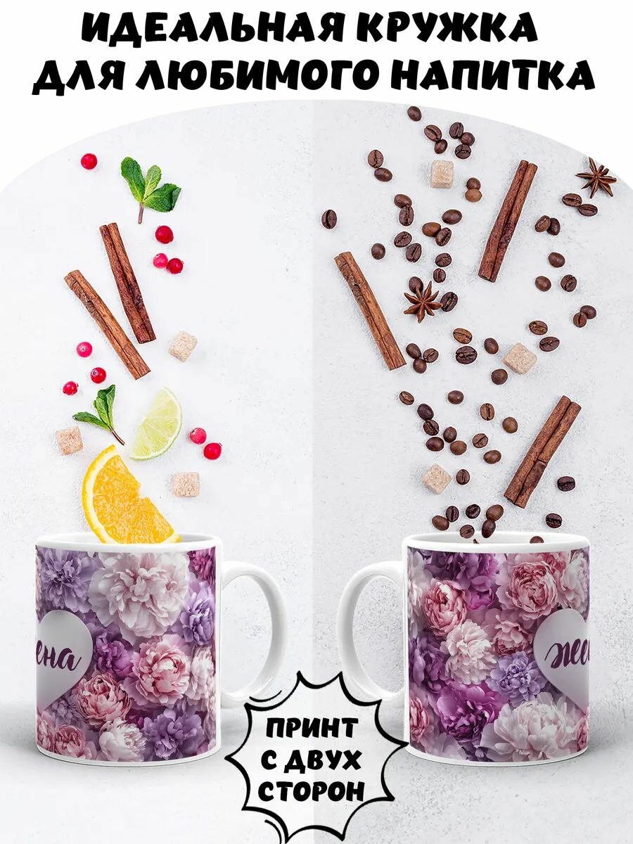 10 цен на Кружка керамическая для чая и кофе с принтом и надписью подарок для жены "Пионы - жена"