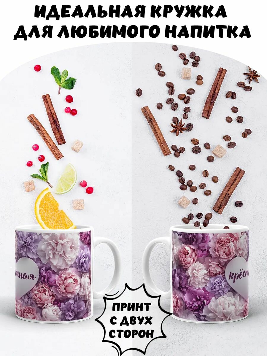 10 цен на Кружка керамическая для чая и кофе с принтом и надписью подарок крестной "Пионы - крестная"