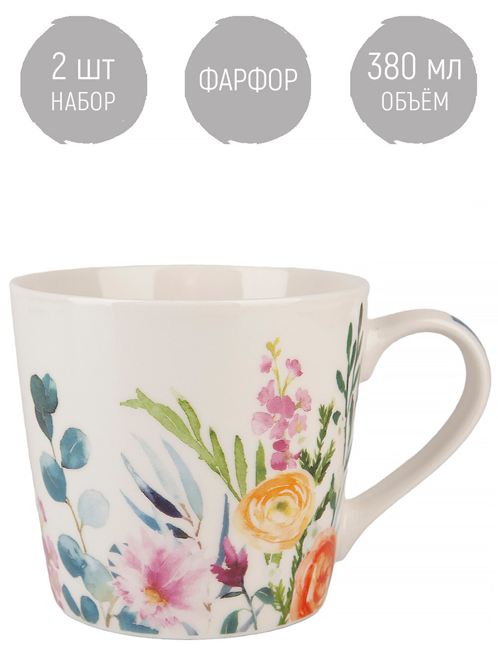 10 цен на Набор кружек 2 шт. Floristry, 13х10х9 см, объем 380 мл, белый/розовый/зеленый/красный, фарфор, Nouvelle