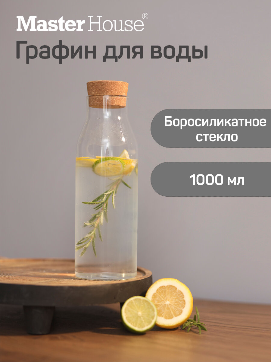 10 цен на Графин для воды стеклянный 1л с крышкой из пробки жаропрочный
