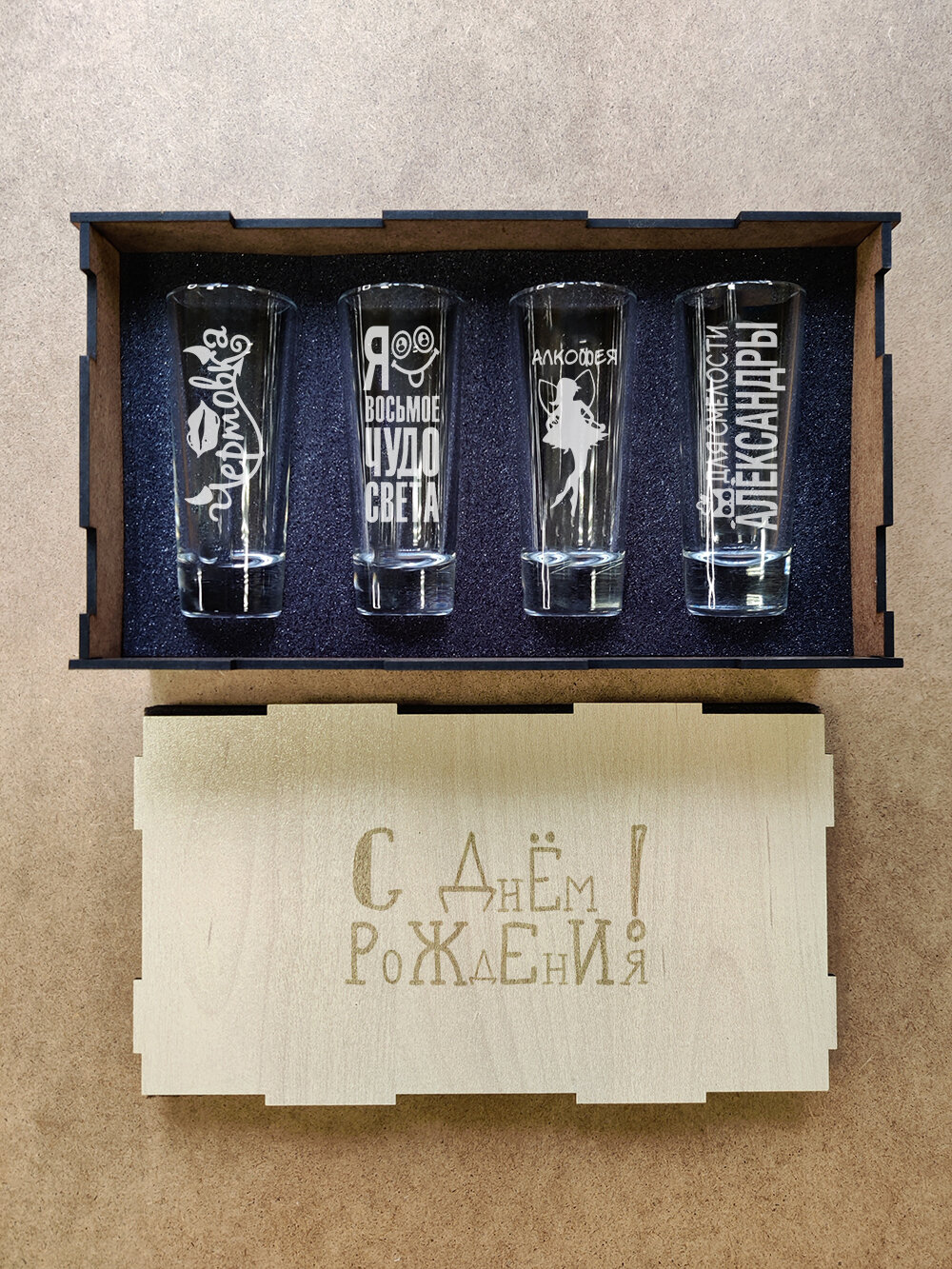 Подарочный набор стопок в коробке с гравировкой - ДР Саша информация: