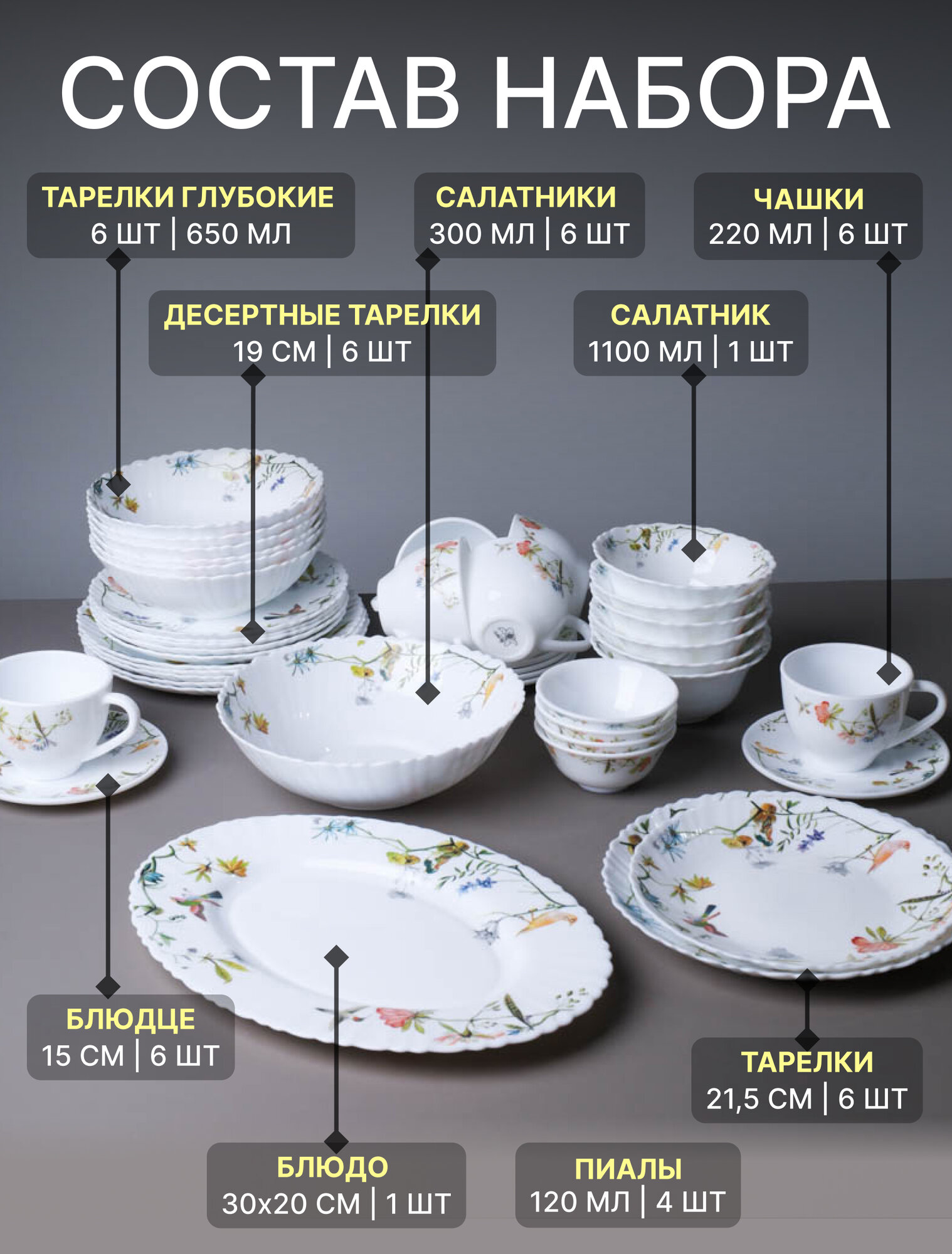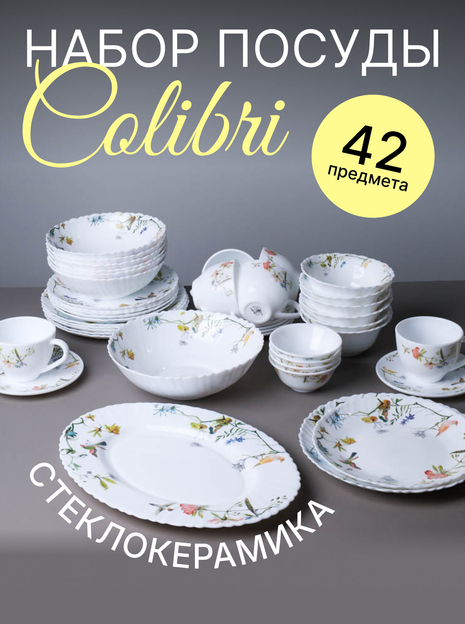 Столовый сервиз WHITE LILY Colibri, стеклокерамика, 42 предмета на 6 персон информация: