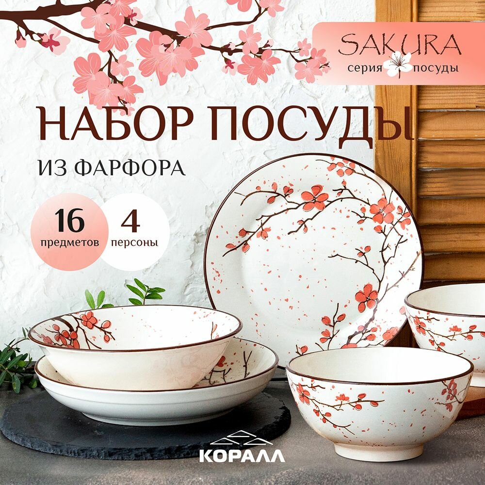 10 цен на Набор посуды из фарфора на 4 персоны 16 предметов "Sakura", столовый сервиз обеденный набор тарелок