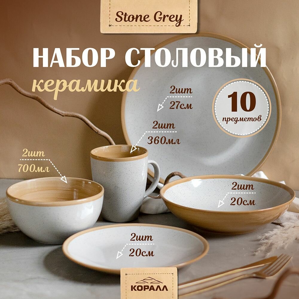 Набор посуды на 2 персоны 10 предметов Stone grey керамика, столовый сервиз обеденный информация: