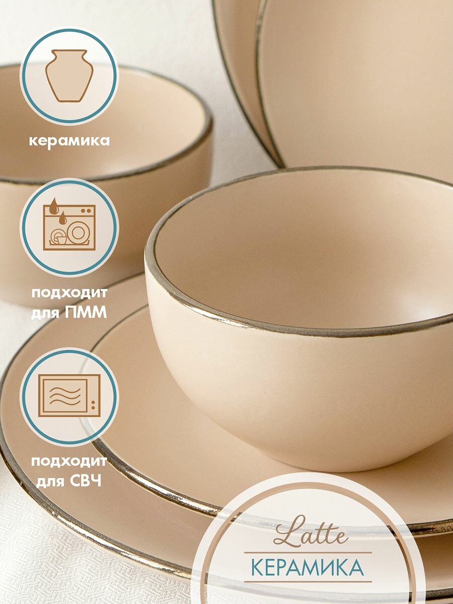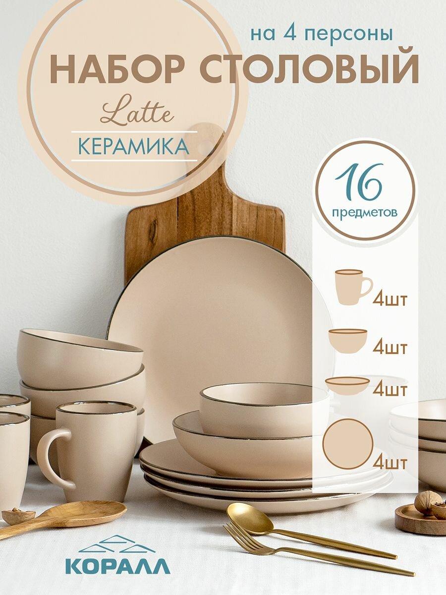 10 цен на Набор посуды из керамики на 4 персоны 16 предметов "Latte", сервиз столовый с глубокими тарелками