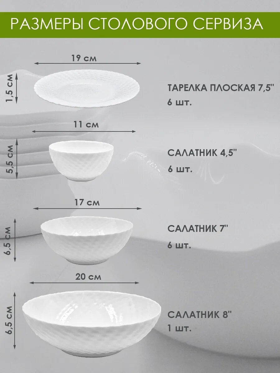 Столовый сервиз на 6 персон из стеклокерамики, 19 предметов, белый информация: