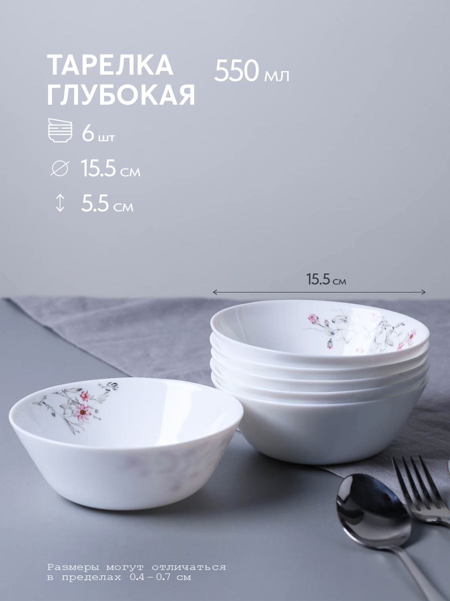 Салатник 480 мл 155 мм тарелка глубокая WHITE LILY "Кустовая роза" 6 штук