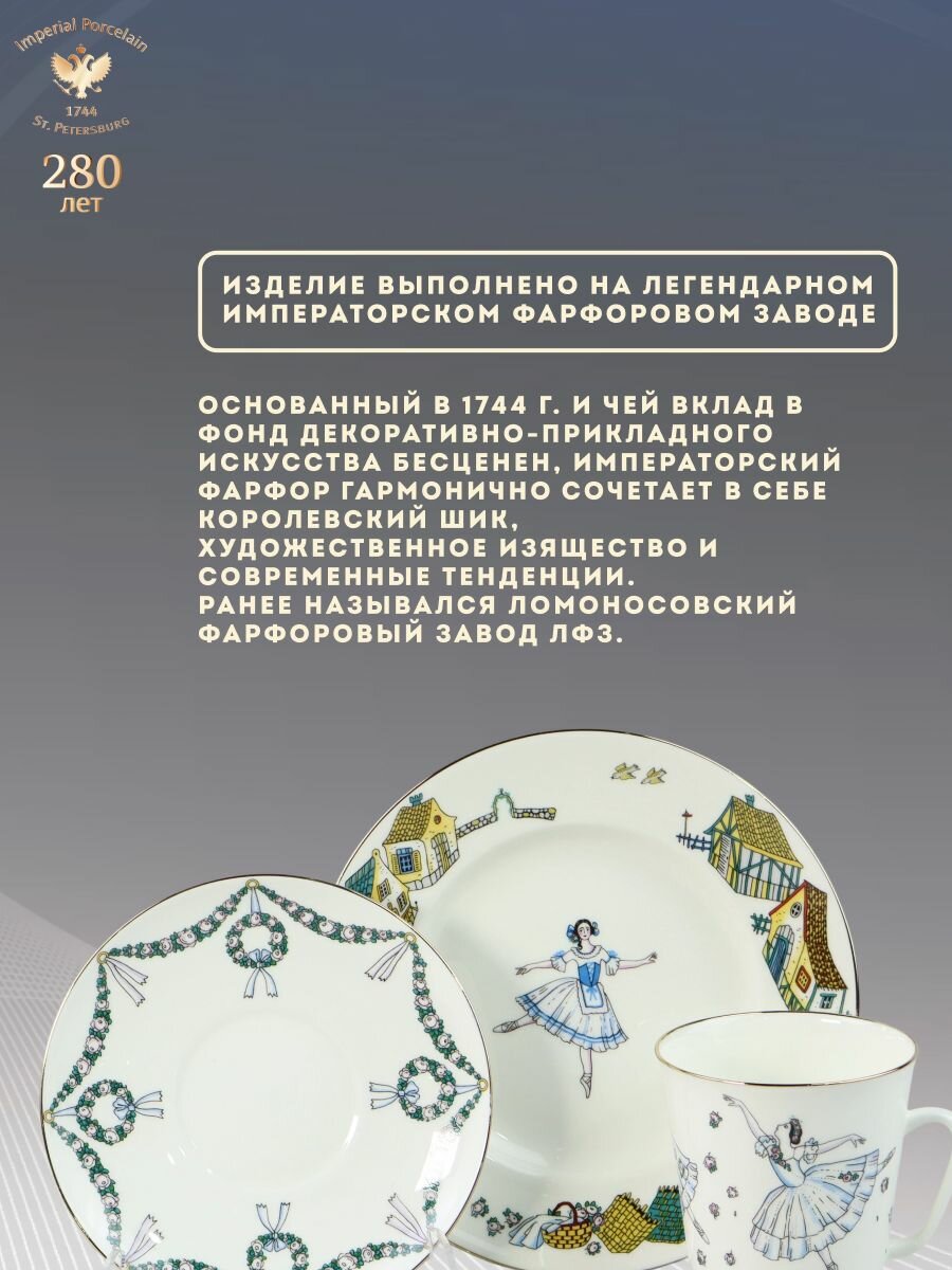 Кофейный набор 165 мл. Форма "Майская", рисунок "Балет. Жизель". Костяной фарфор. 3 предмета. Кофейная пара с десертной тарелкой. Императорский фарфоровый завод ИФЗ ЛФЗ информация: