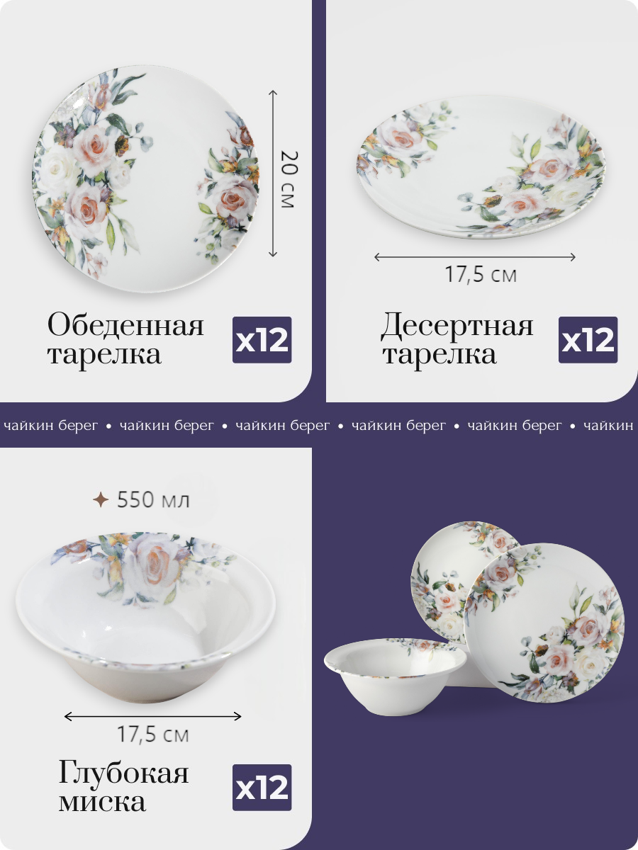 10 цен на Набор тарелок на 12 персон из фарфора, 36 предметов, коллекция "Розы"