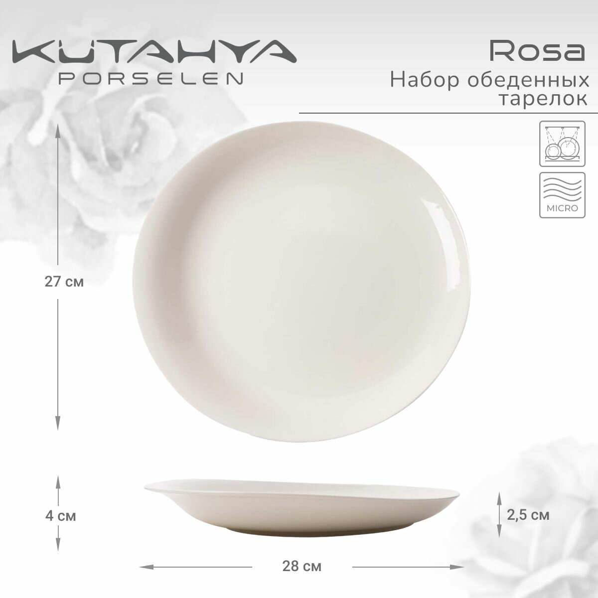 Набор обеденных тарелок Kutahya Rosa, 28 см, фарфор, белые, 4 шт. информация: