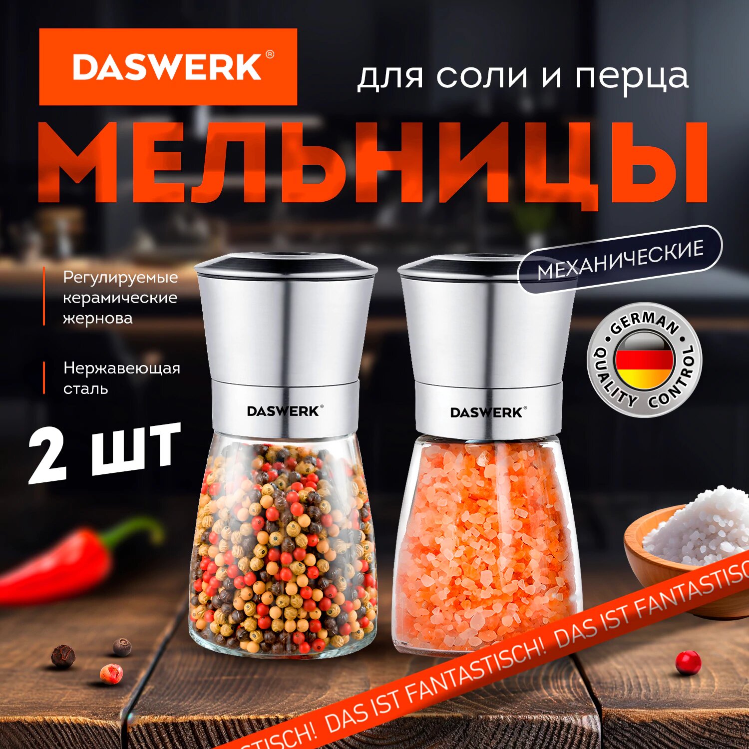 Мельница для специй и соли ручная механическая, набор 2 штуки, измельчитель кухонный для соли, перца и приправ, Daswerk информация: