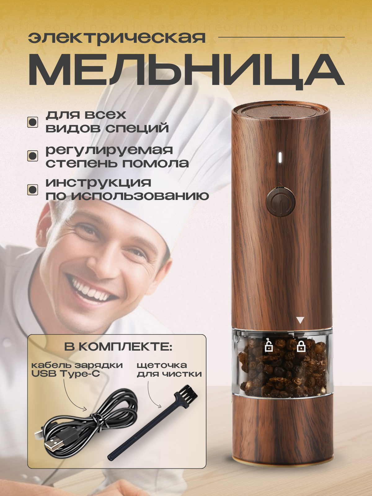 Мельница для специй, керамические жернова, электрическая, регулировка помола. 2шт. Цвет Под дерево информация: