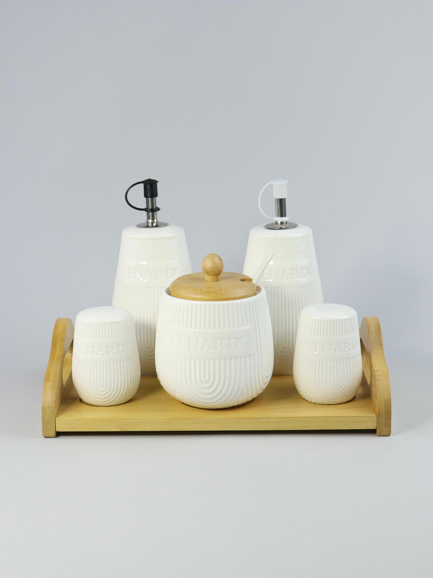 Набор для специй с сахарницей и бутылки для масла и уксуса. 5 предметов на подставке "Bamboo". Фарфор. Подарочная упаковка. Lenardi. информация: