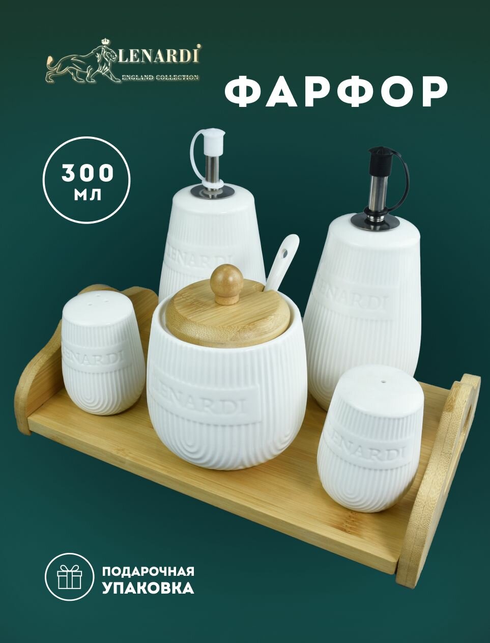 Отзывы на Набор для специй с сахарницей и бутылки для масла и уксуса. 5 предметов на подставке "Bamboo". Фарфор. Подарочная упаковка. Lenardi.
