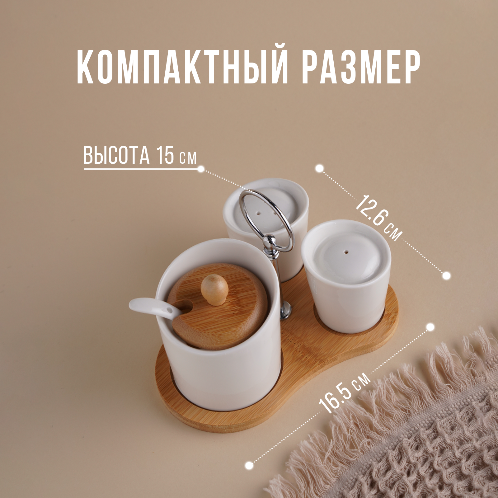 Набор керамический для специй на деревянной подставке Доляна "Эстет. Герда", 3 предмета: солонка, перечница, сахарница с ложкой 1 130 ₽