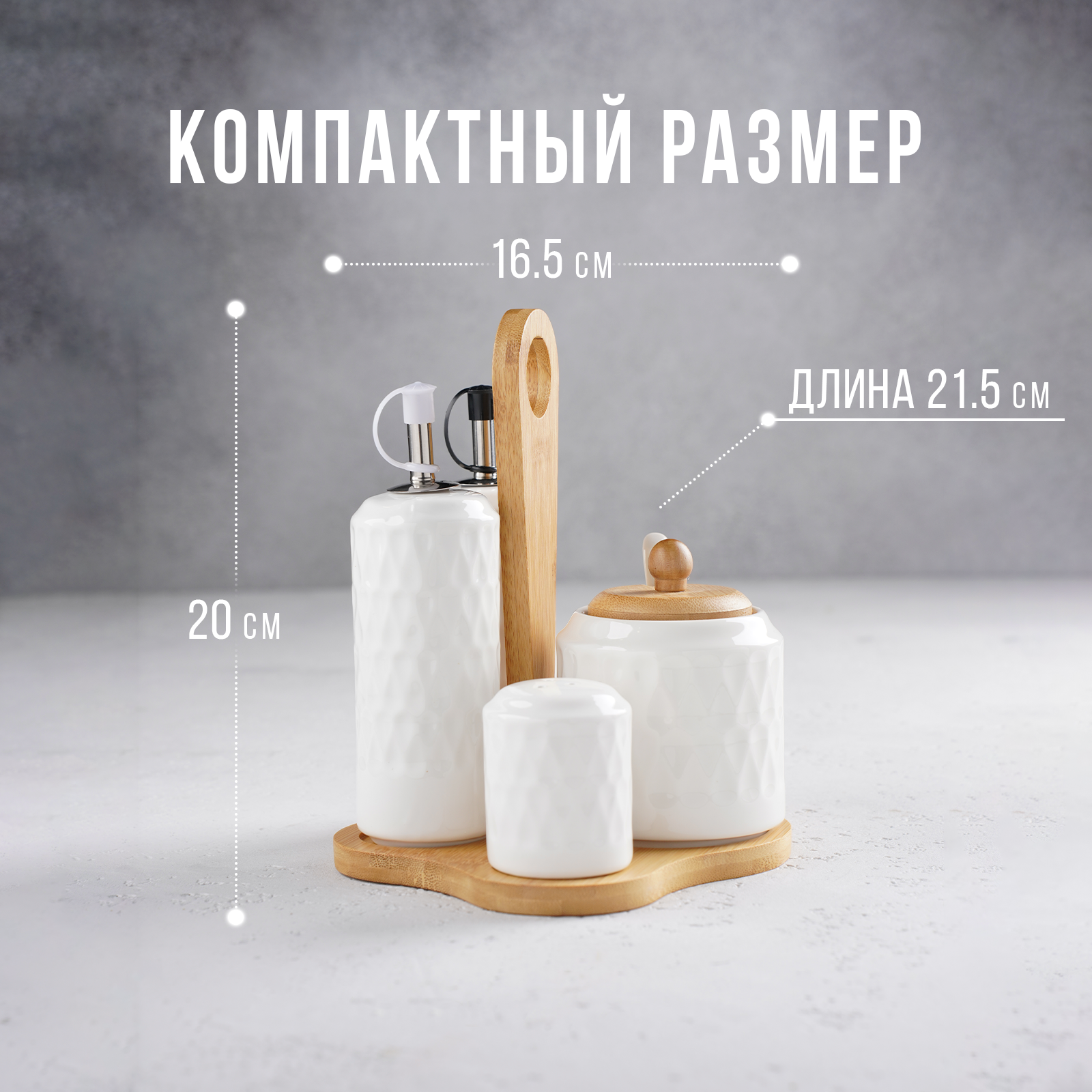 Солонка и перечница фарфоровая с дозаторами для масла BellaTenero, набор для специй на бамбуковой подставке 626 ₽